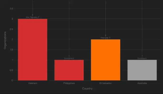 ✅ Targeting Patterns: Selective attacks on government, telecommunications, and financial sectors in Philippines, Vietnam, El Salvador—exact match to Lotus Panda's historical area of responsibility (AOR)