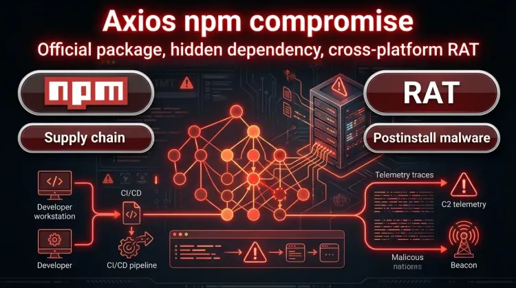 The Axios incident is a sharp reminder that defenders cannot evaluate package safety only by reading the top-level repository diff. A single dependency change in a trusted release can be enough to deliver cross-platform malware at install time.